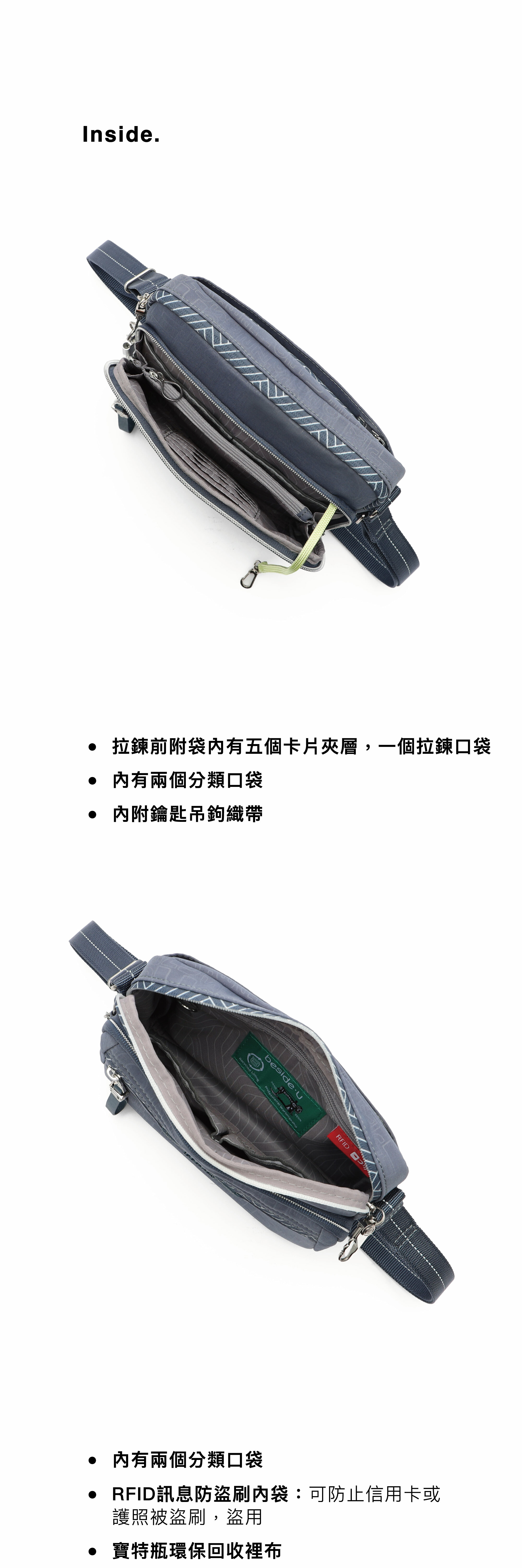 * 1 個 RFID 條信息防盜拉鍊口袋。
