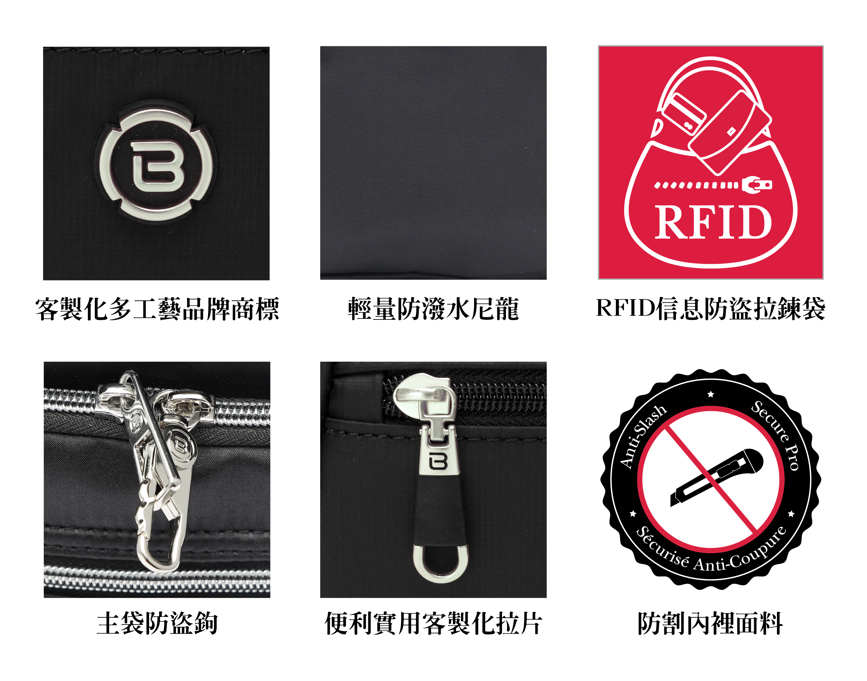 * 1 個 RFID 條信息防盜拉鍊口袋。