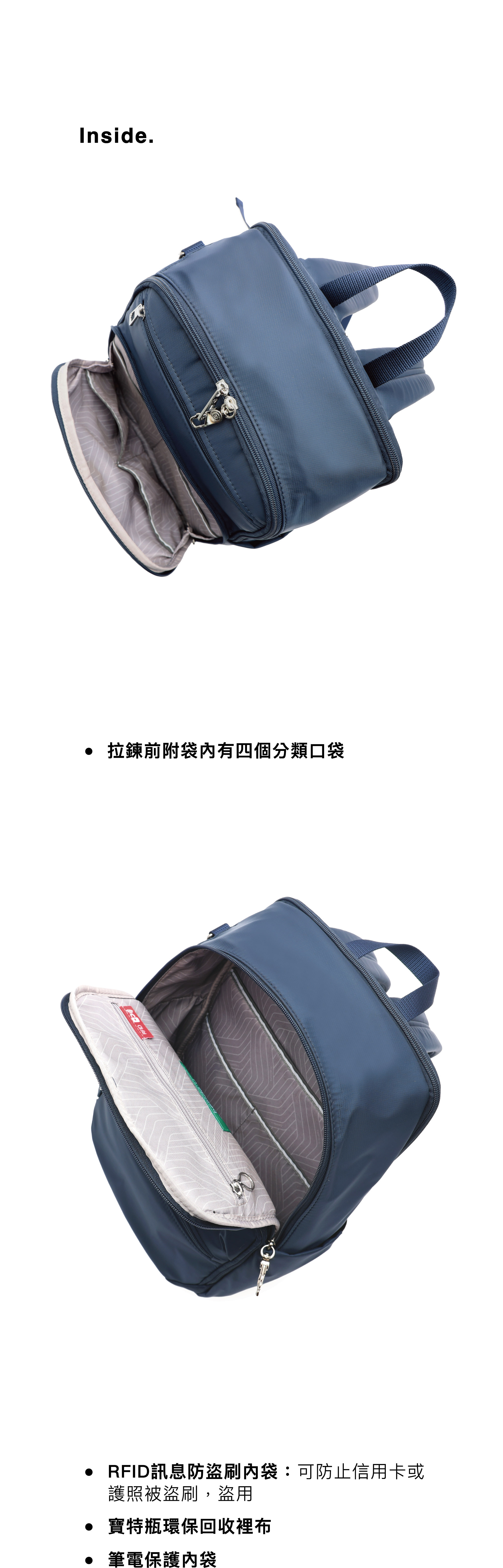 * 1 個 RFID 條信息防盜拉鍊口袋。