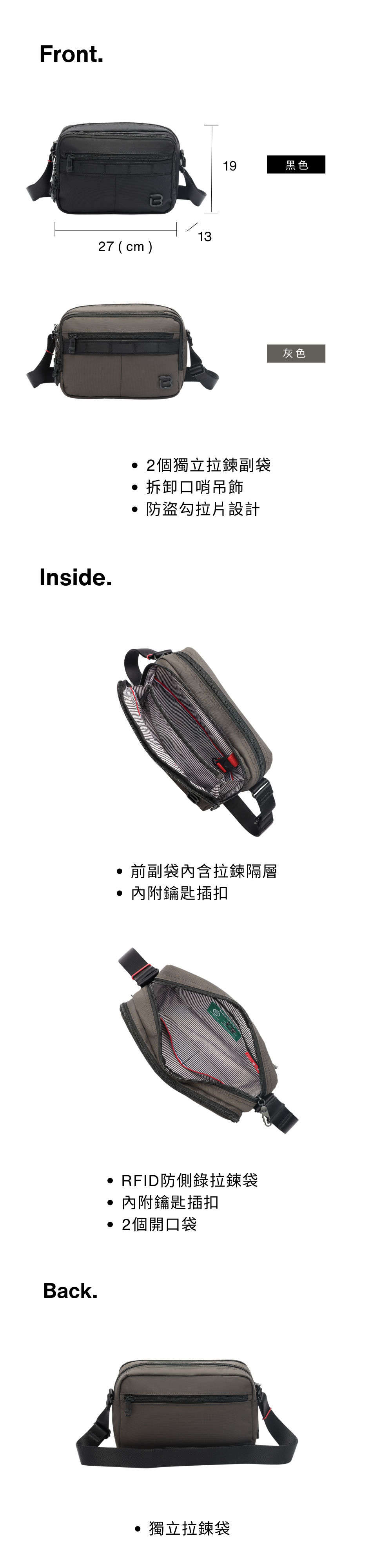 * 1 個 RFID 條信息防盜拉鍊口袋。