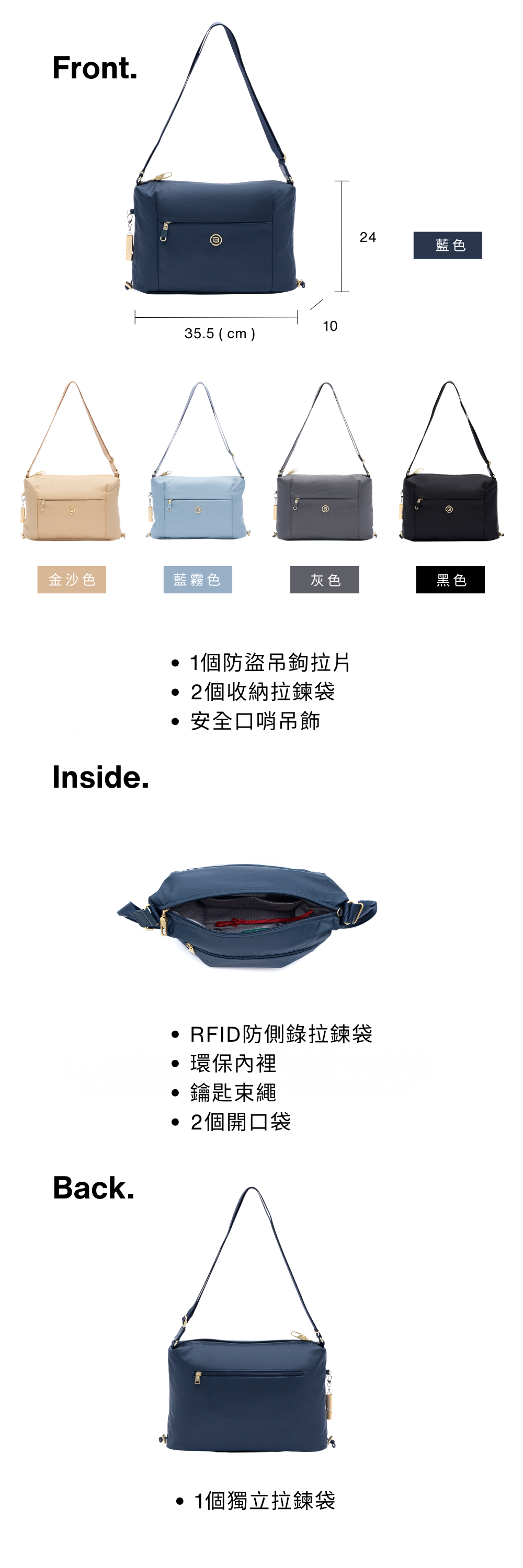 * 1 個 RFID 條信息防盜拉鍊口袋。