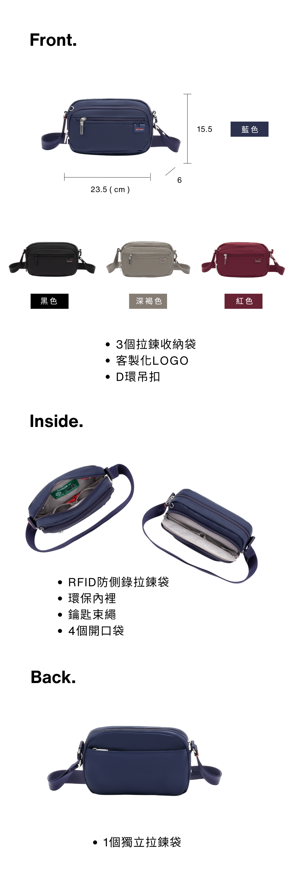 * 1 個 RFID 條信息防盜拉鍊口袋。