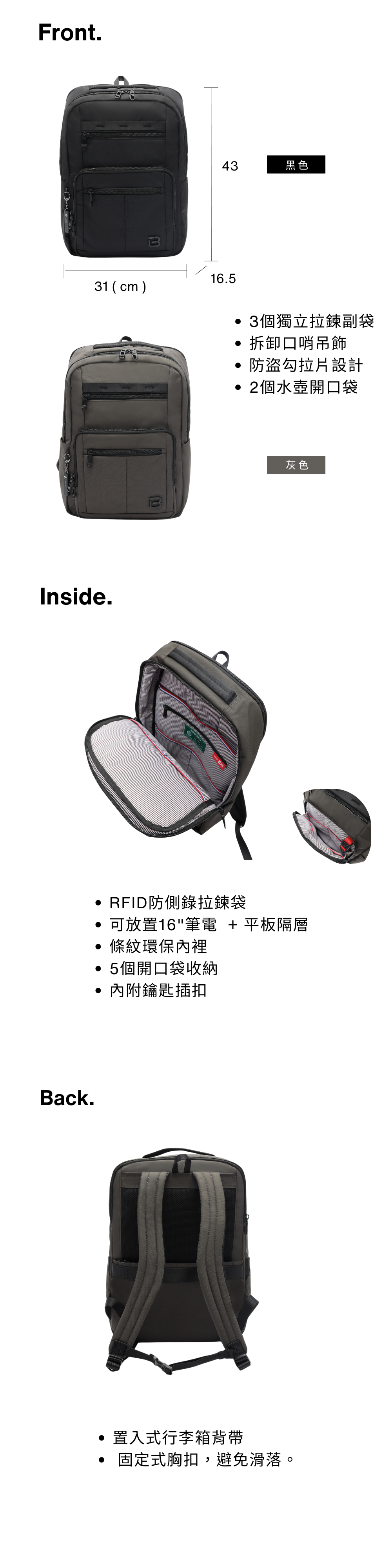 * 1 個 RFID 條信息防盜拉鍊口袋。