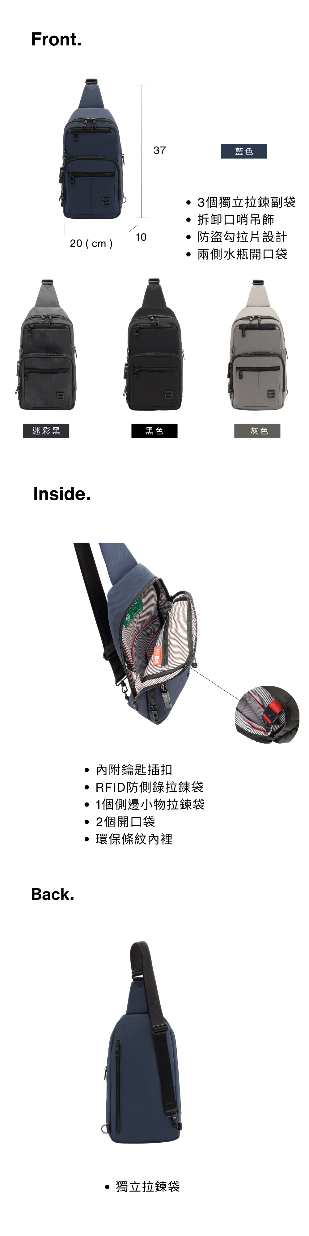 * 1 個 RFID 條信息防盜拉鍊口袋。