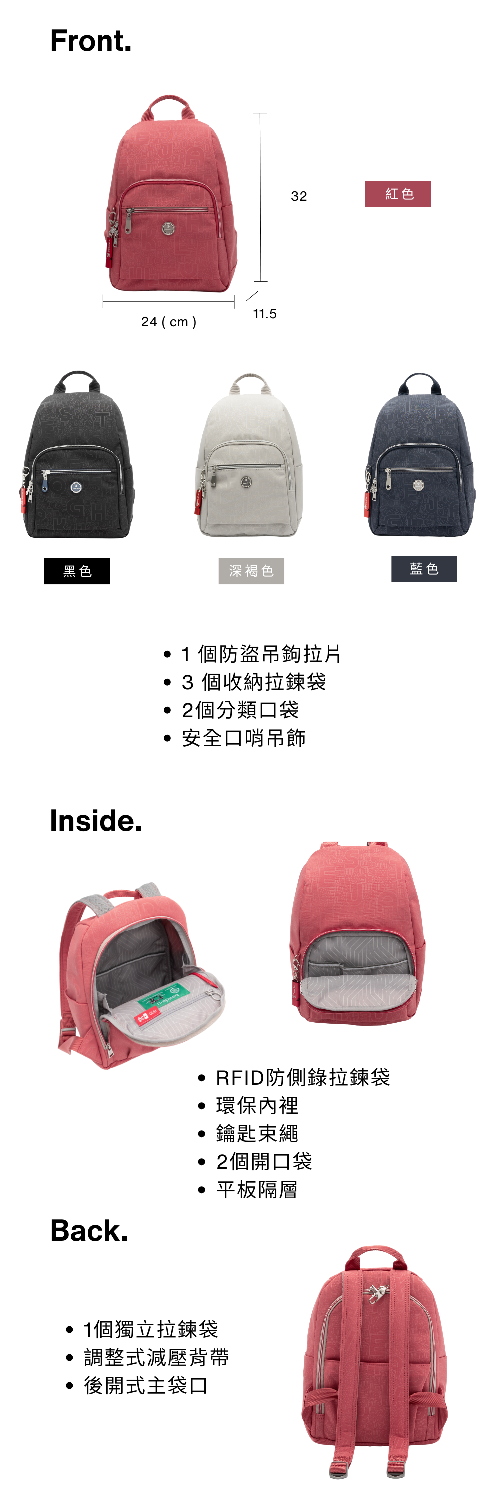 * 1 個 RFID 條信息防盜拉鍊口袋。
