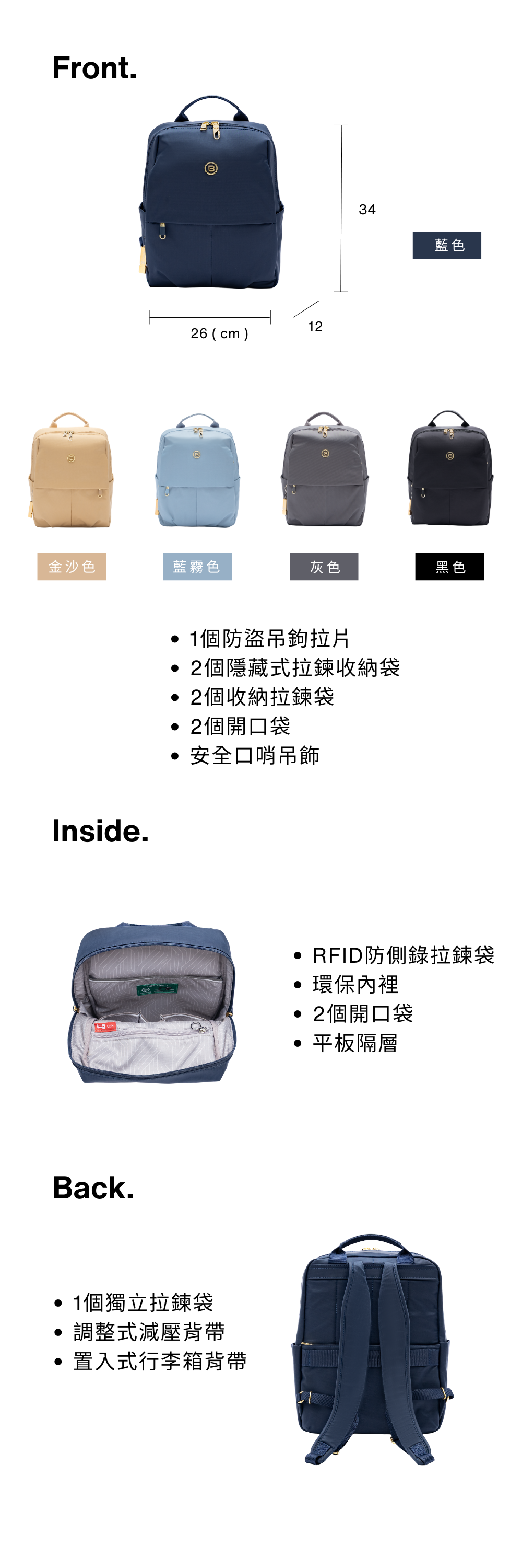 * 1 個 RFID 條信息防盜拉鍊口袋。