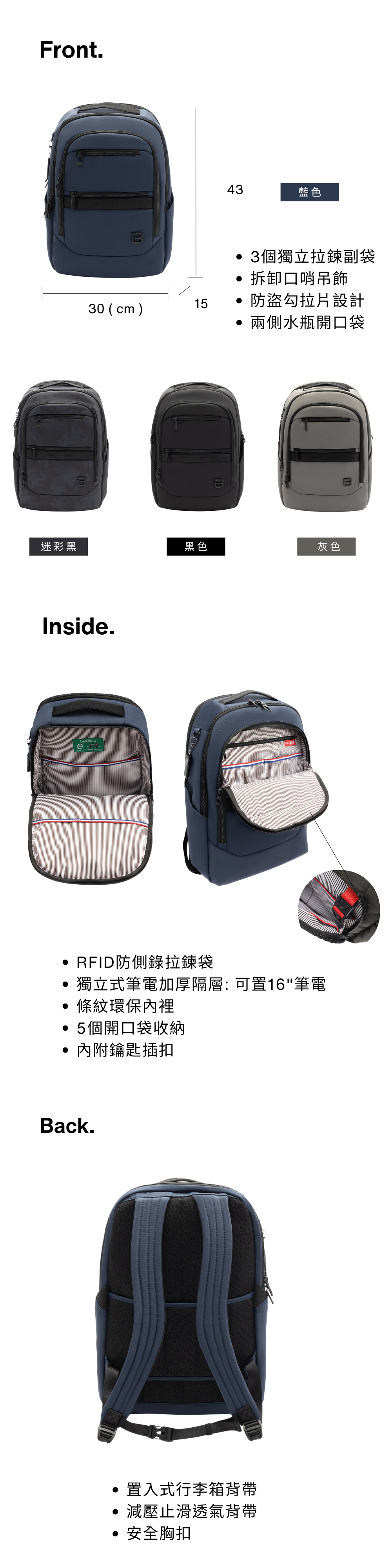 * 1 個 RFID 條信息防盜拉鍊口袋。