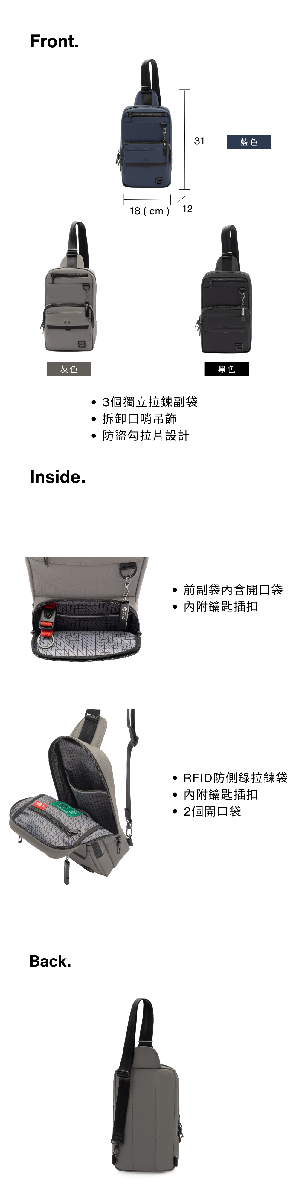 * 1 個 RFID 條信息防盜拉鍊口袋。